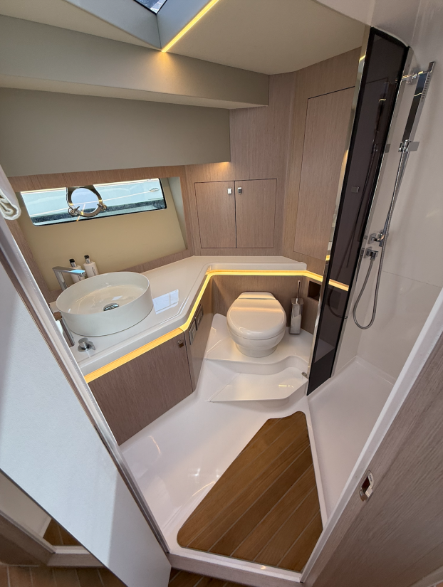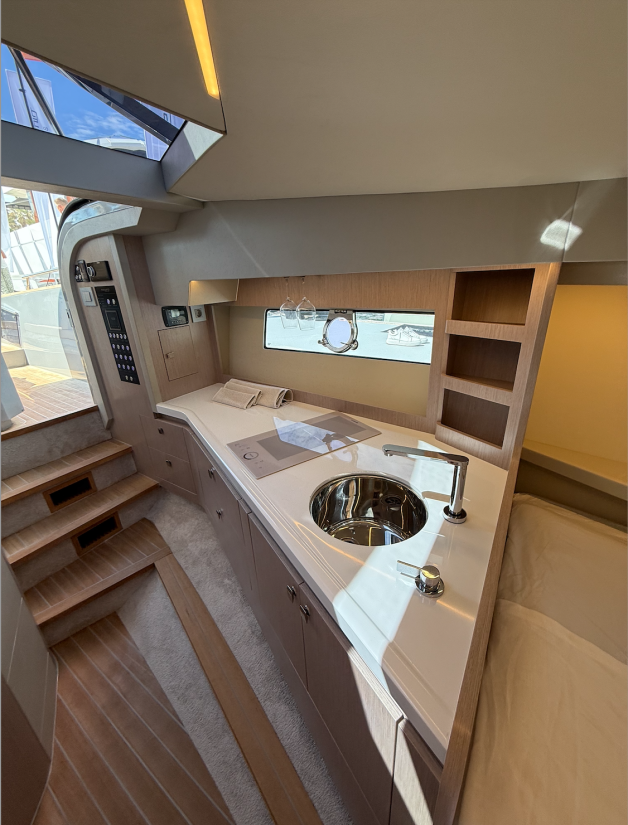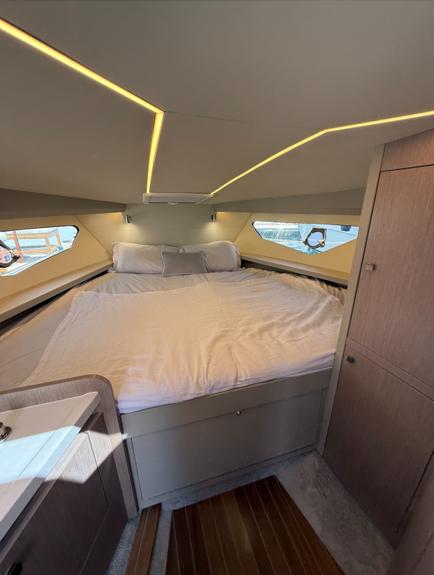 A belső térben modern konyhapult, indukciós főzőlap, rozsdamentes mosogató és rejtett tárolók várják a vendégeket, a tágas fekvőhely és a zuhanyzós fürdőszoba pedig biztosítja a kényelmet akár hosszabb utak során is. A hajó megjelenése magabiztosságot sugároz, miközben kialakítása lehetővé teszi, hogy ne kelljen választani a sportos menetteljesítmény és a pihenésre alkalmas tér között a Forza 37 mindkettőt egyszerre nyújtja.
